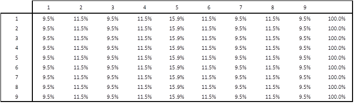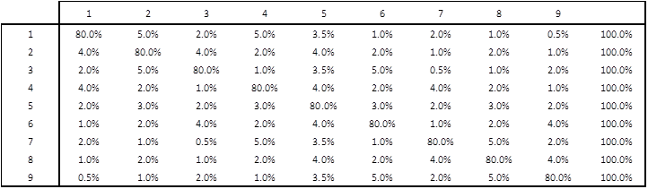 Since the transition matrix is stationary, aperiodic (no time limitations from transiting from one state to the other) and has no recurrent state (states with probability of 0, transition state, or 1, absorbing state), it is also said to be ergodic, that is, the system has the same average behavior over a long period of time. Multiplying the matrix by itself 128 times, I get to the following matrix (Table 3).