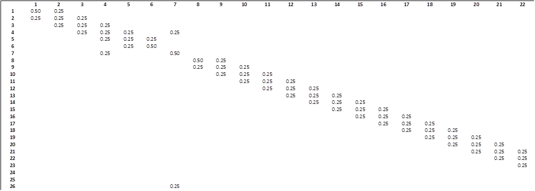 Having defined the coordinates and the possible movements, I can define the transition matrix. Since I have 305 possible positions, the transition matrix will be a 305 x 305 matrix (Figure 5). From each position, the character can do, at most, 4 different movements. That way, at least 301 movements will have a zero (for instance, the probability of going from position 127 to 29 in a single step is zero).