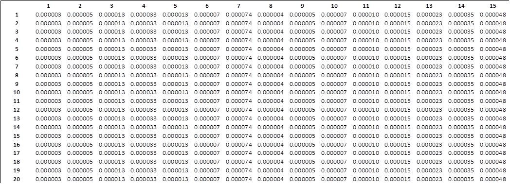 Multiplying the matrix by itself 64000 times (since there were many coordinates, it took a while for the probabilities to stabilize), I get to the matrix shown in Figure 6. This stabilized matrix shows that, after a long time, the probability of the character being in each coordinate does not depend on the starting point. This is true because of the ergodic property of the system. When stabilized, it is said that the system achieved stationary regime.