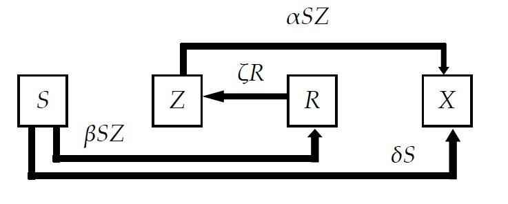 One of the biggest limitations of the model presented by Munz et al. (2009) was the fact that the destroyed zombie could always be “resurrected”. Both Flanagan (2012) and Blais & Witkowski (2013) thus proposed a model where the zombie could be permanently removed. The model with permanent removal presented by Blais & Witkowski can be seen in Figure 2.