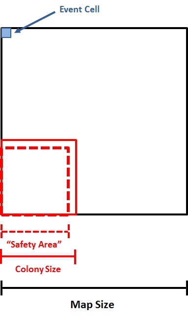 Inside the map, a number of humans and of zombies are randomly placed. The humans are distributed inside the colony while the zombies are distributed outside of it.