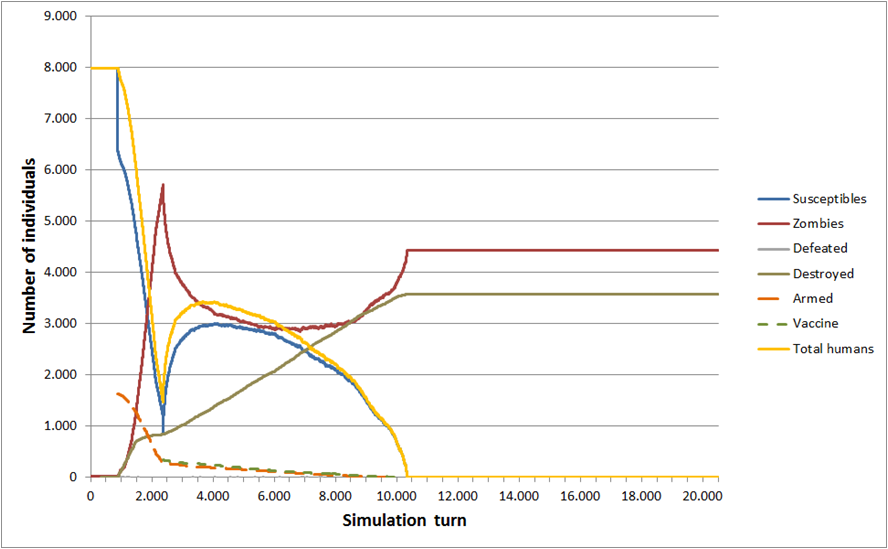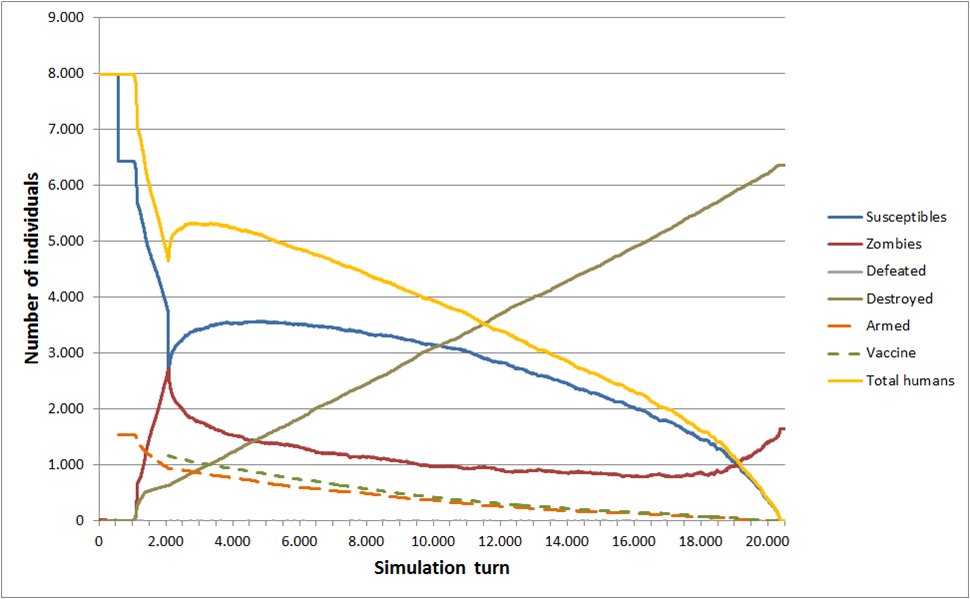 On the fourth scenario (Figure 7), the percentage of the population trained and equipped with weapons went up from 20% to 25%, and the time necessary to do so returned to 500 turns after the first infection. As a result, the initial surge of contamination was partially contained, with a peak of close to 2,000 zombies at the time the vaccine was distributed (lower than in the previous scenarios). Similarly to the first scenario, though, the zombies slowly managed to contaminate humans equipped with weapons and vaccines, resulting, once again, on the extermination of humanity after close to 20,000 turns.