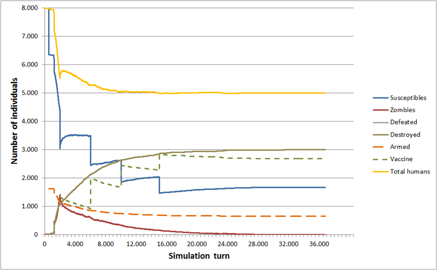 Finally, a sixth and last scenario (Figure 9) was created. Deciding to defeat the zombies at all costs, four moments of vaccine distribution were stipulated at turns 2,000; 6,000; 10,000; and 15,000. Finally, humanity managed to eradicate the zombies, but with the loss of 3,000 lives.