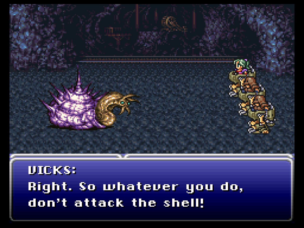 Figure 2. The very first boss in Final Fantasy VI, Whelk (left) ambushes two Imperial soldiers and female protagonist Terra (right). And yes, do not attack the shell: it may have great scientific value! (Screenshot from the actual game.)