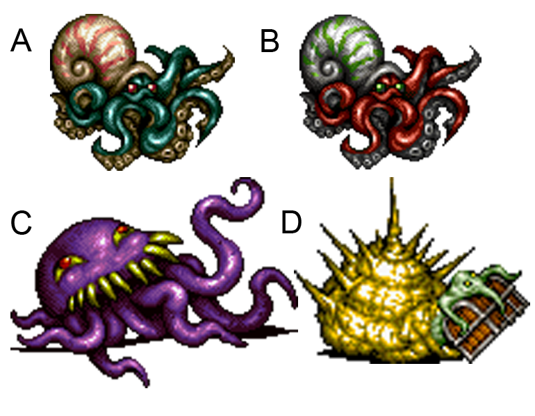 Figure 4. Mollusk enemies in Final Fantasy VI (sprites from the mobile version of the game). A. Nautiloid. B. Cephaler. C. Ultros. D. Presenter.
