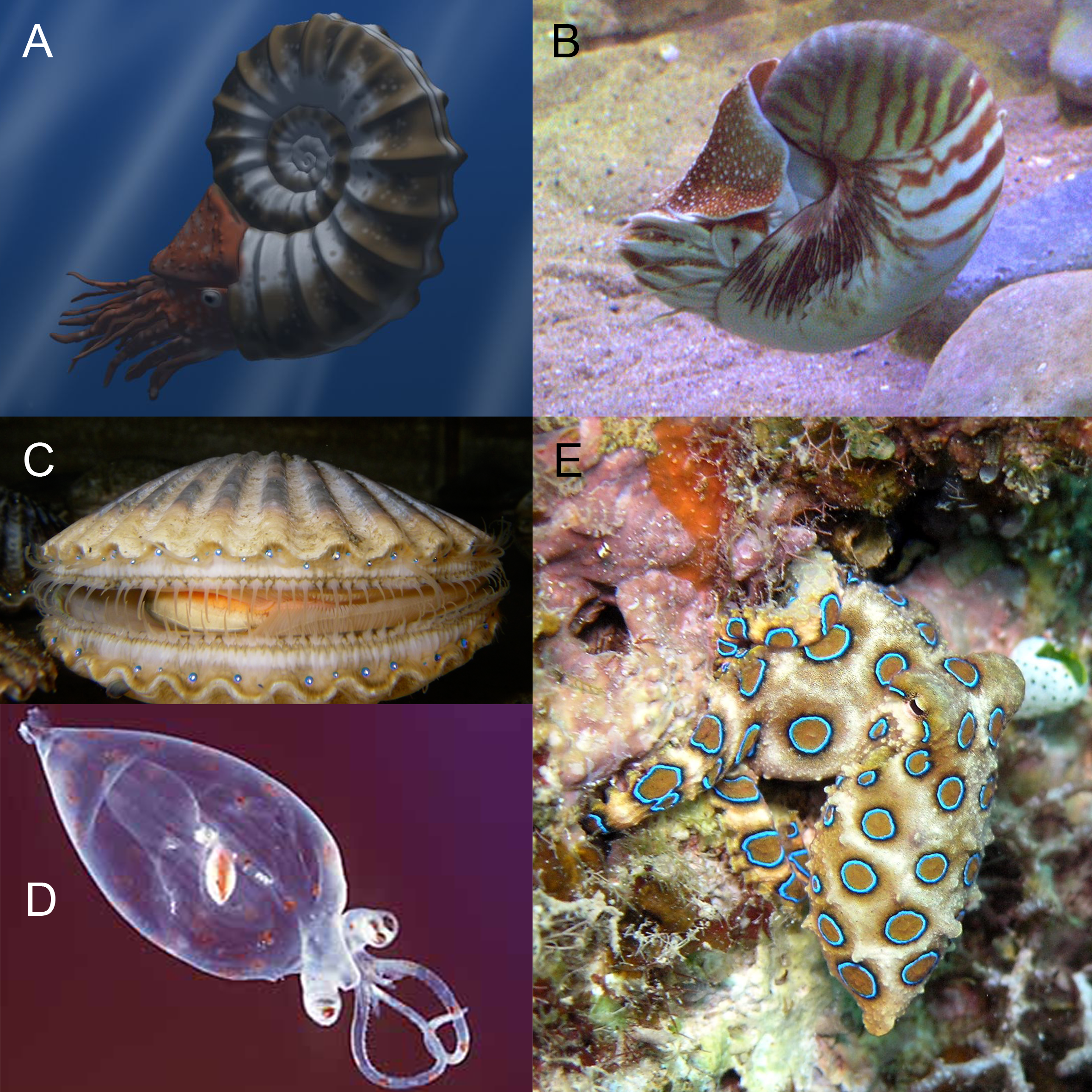 Figure 5. Plausible real-life inspirations for 16-bit Final Fantasy molluks. A. A digital reconstruction of the ammonoid Asteroceras obtusum by Nobu Tamura. B. A live specimen of Nautilus pompilius. C. A live individual of the scallop Argopecten irradians. D. Photo of a glass squid (Cranchiidae) juvenile by Uwe Kils. E. A photo of the blue-ringed octopus Hapalochlaena lunulata, by Jens Petersen. (All images were extracted and modified from Wikimedia Commons; images are public domain unless otherwise stated.)