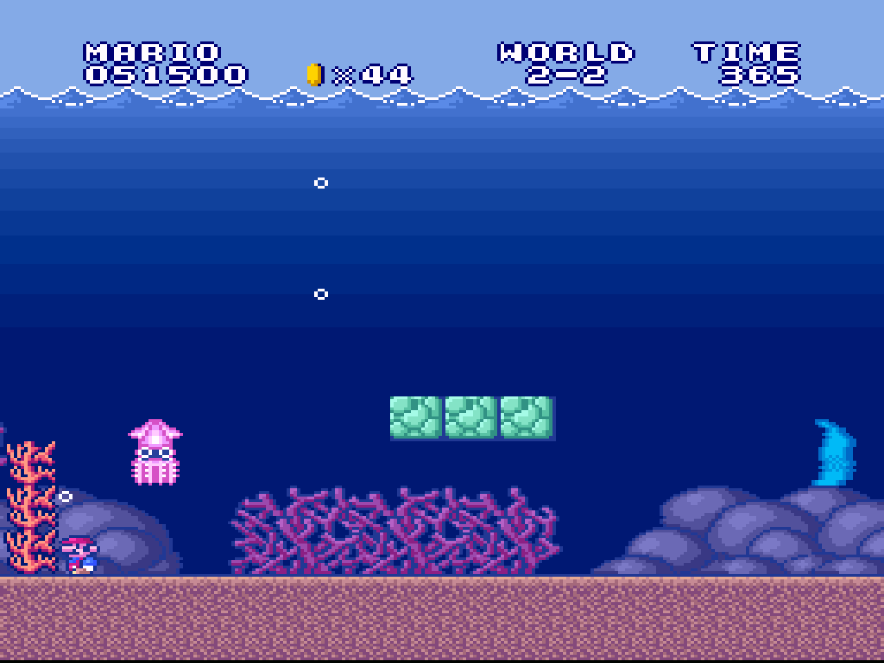 Figure 6. Blooper the squid welcomes Mario to the underwater world in the SNES version of Super Mario Bros. (Screenshot from the actual game.)