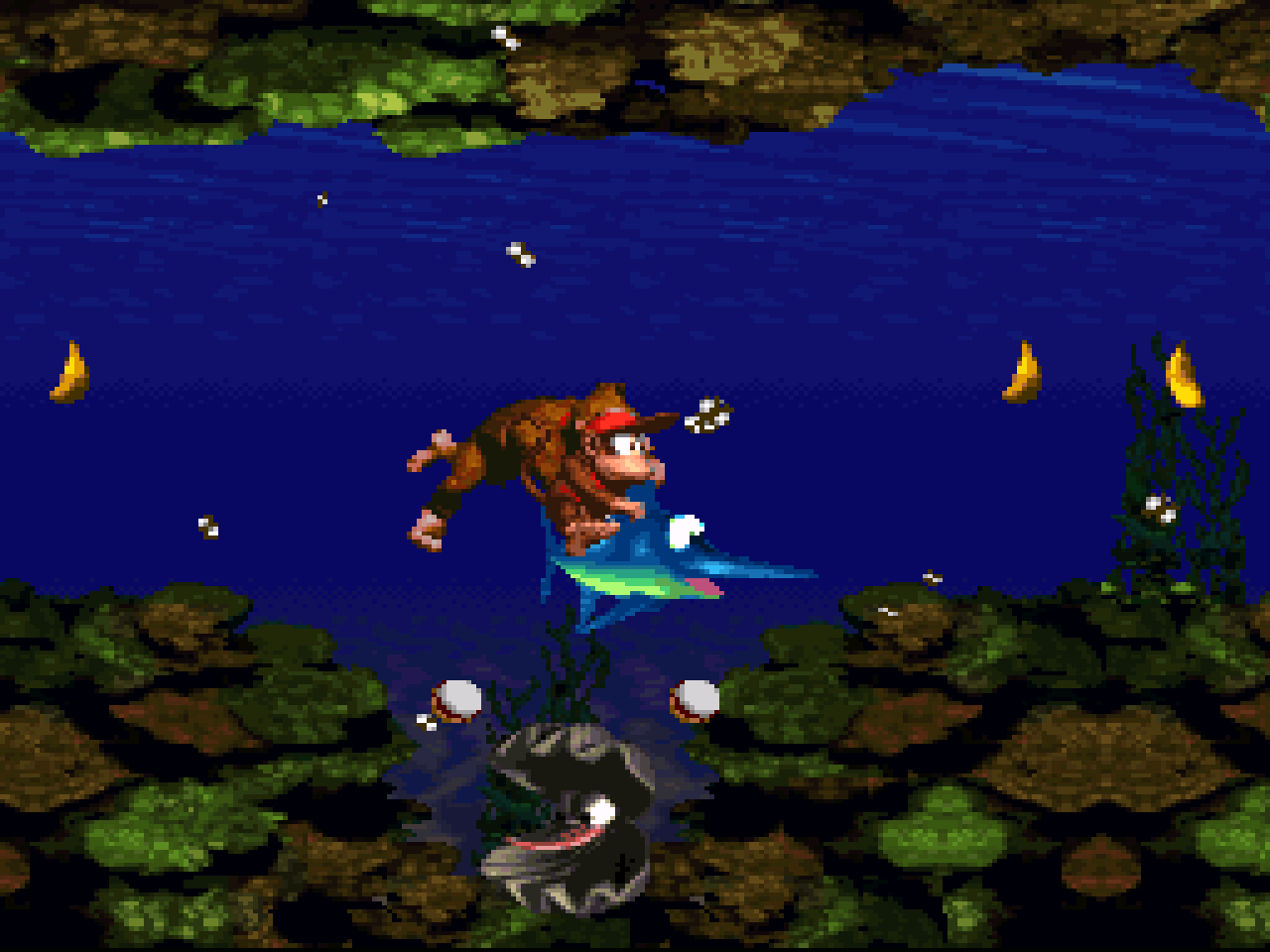 Figure 10. A common underwater enemy, Clambo (at the bottom) throws pearl bullets at the Kongs. (Screenshot from the actual game.)