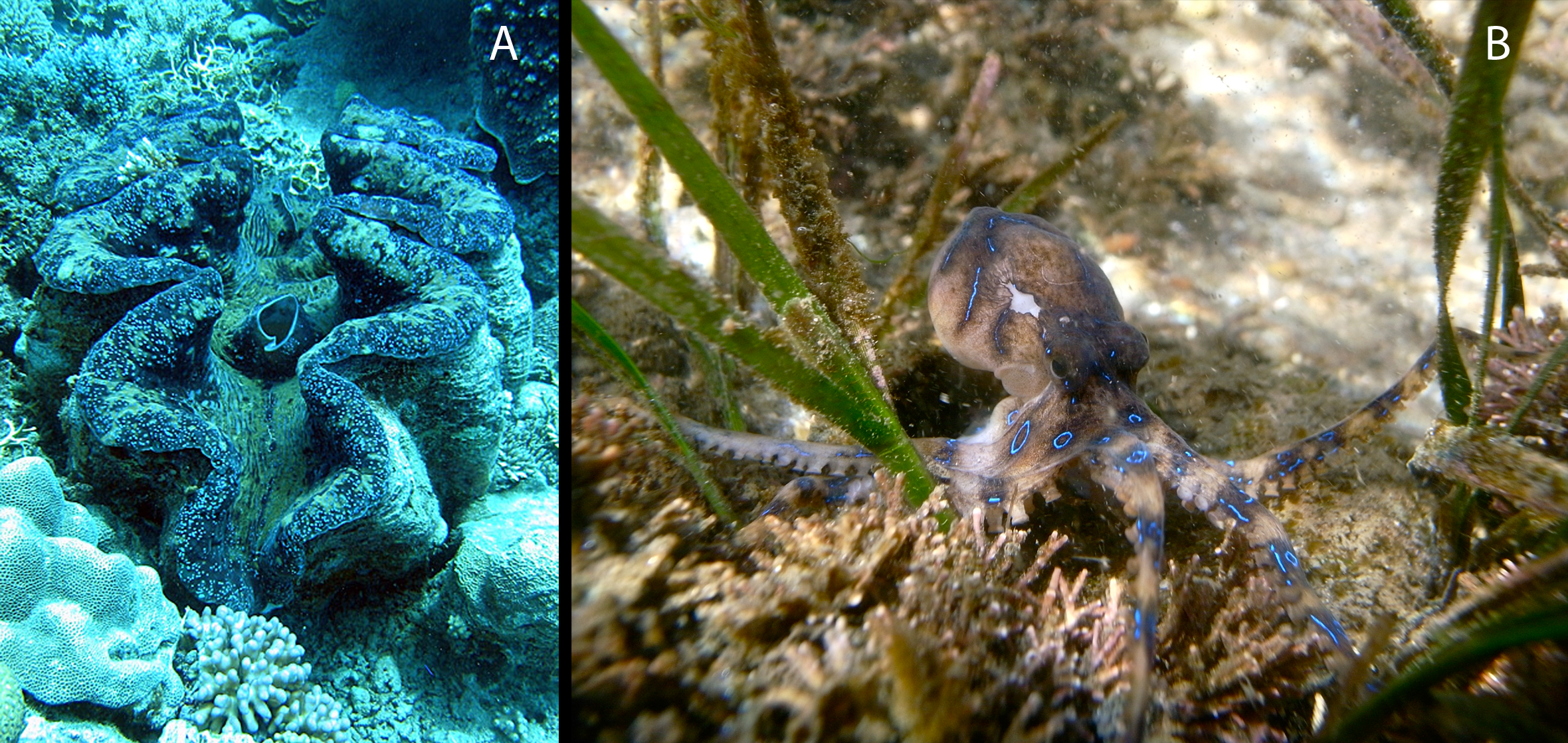 Figure 12. Possible real-life inspirations for Clambo and Croctopus, respectively. A. A live specimen of Tridacna (public domain image). B. A blue-ringed octopus, Hapalochlaena maculosa (photo by Sylke Rohrlach, extracted and modified from Wikimedia Commons).
