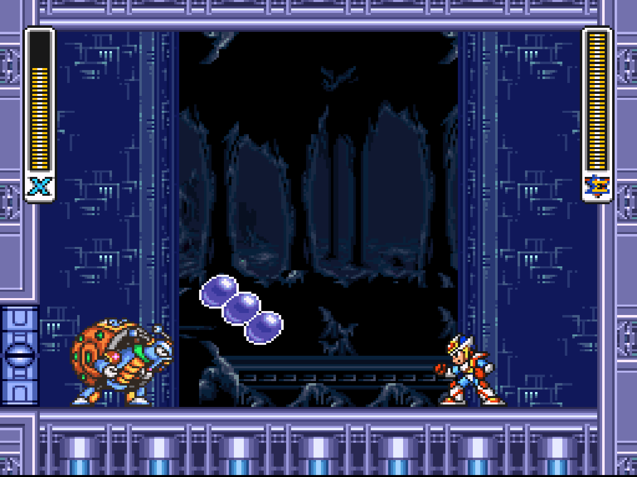 Figure 14. Mega Man X (right) versus Crystal Snail (left). (Screenshot from the actual game.)