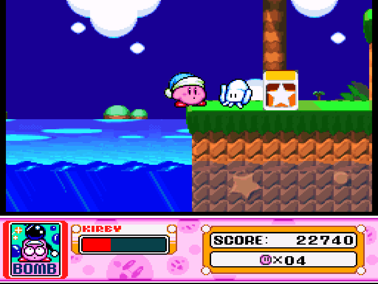 Figure 19. Kirby (left) and Squishy (right) have a nice conversation by the sea in Kirby Super Star. (Screenshot of the actual game.)