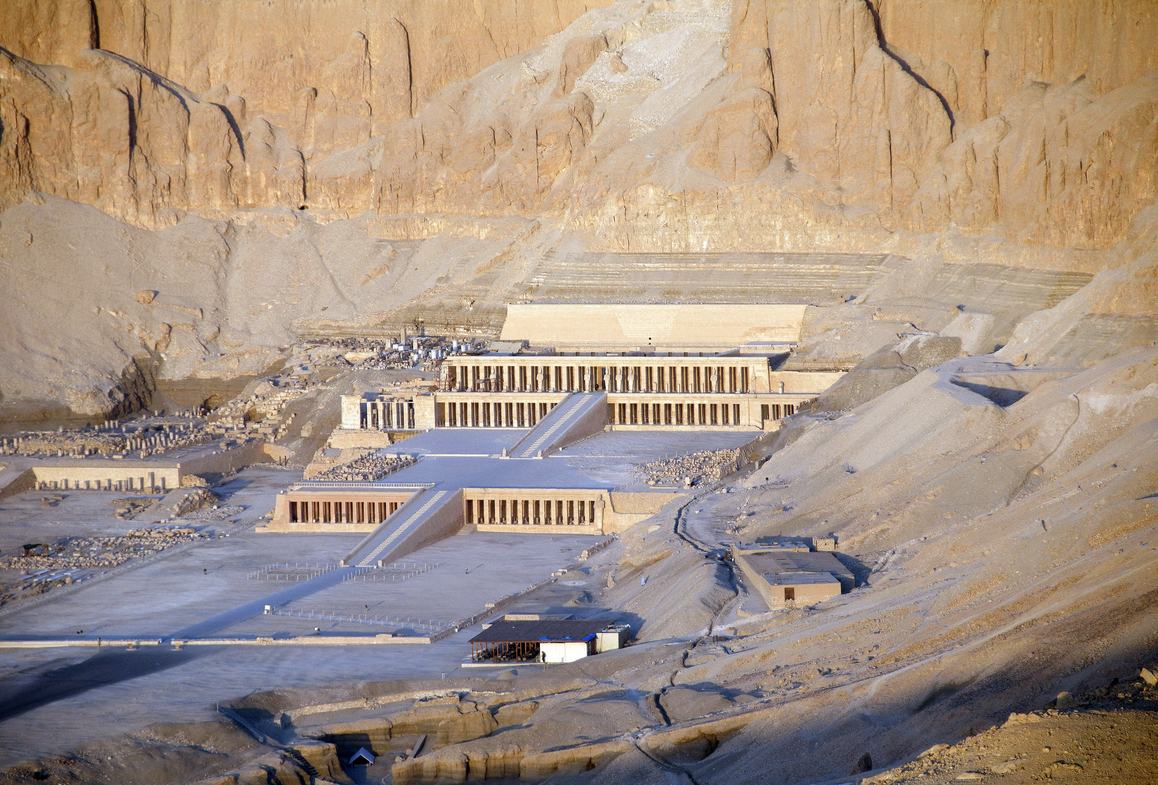 As an architect, Senenmut’s most remarkable project was Hatshepsut’s mortuary temple at Deir el-Bahari (in ancient Thebes, modern Luxor), on the West bank of the Nile close to the Valley of the Kings. The temple, also known as “Djeser-Djeseru” (“Holy of Holies”), is one of Ancient Egypt’s most beautiful buildings, designed in several different levels linked by ascending ramps, located against the cliff’s face. It would have been even more awe-inspiring back in Hatshepsut’s day, where a sphinx-lined causeway led visitors from the valley to its grandiose entrance, marked by large pylons.