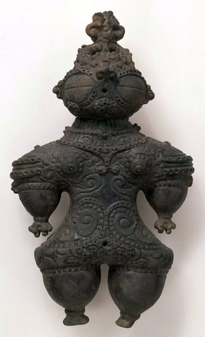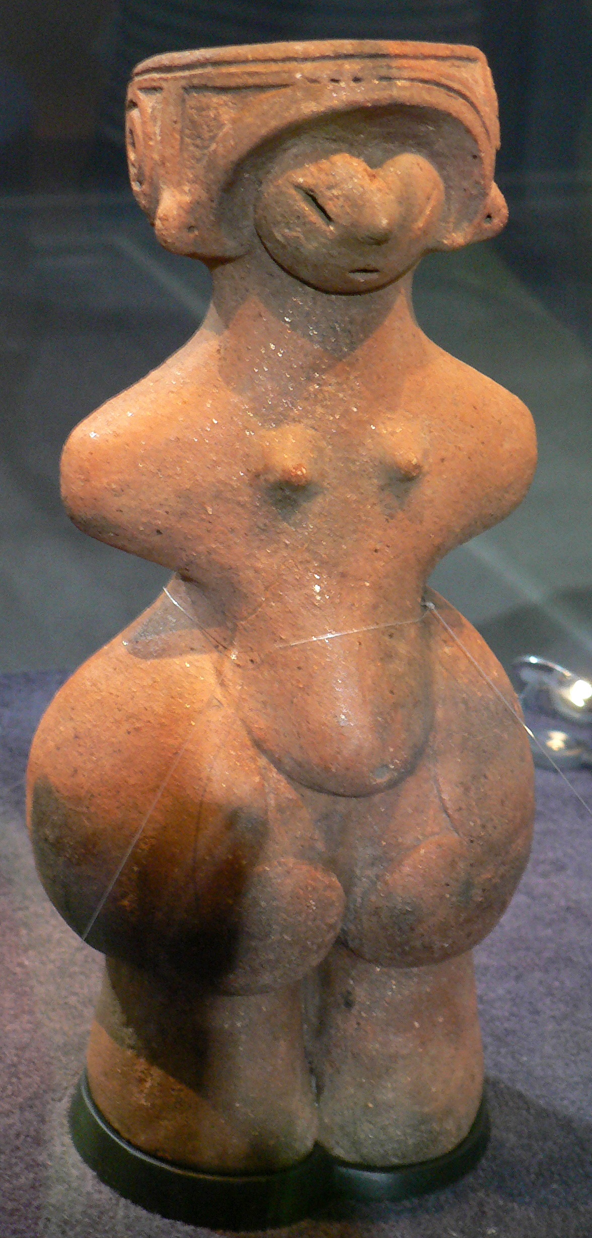 Most of the dogū are clearly female (some of them supposedly pregnant; Fig. 7), so some scholars believe they are representations of an earth-goddess. They claim that this mother-goddess worship is common in agricultural societies, but then again, agriculture was only incipient during the Jōmon period. Other scholars take into consideration the prominence of secondary sex characteristics and hypothesize that the dogū are just general fertility symbols[2], related to fertility rituals and magical protection during dangerous events such as childbirth. This latter option seems apparently more likely, as similar symbols are known from pretty much everywhere.