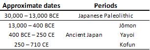 Japanese prehistory can be broadly divided into two large periods: the Paleolithic and what may be informally called “Ancient Japan” (Table 1). The latter is a mixture of the usual Mesolithic, Neolithic and Bronze Age that has defied classification by archaeologists using this standard Western periodization (Imamura, 1996). This span of time contains three periods: the Jōmon, the Yayoi, and the Kofun. Here we are interested only in the first one, the Jōmon period.