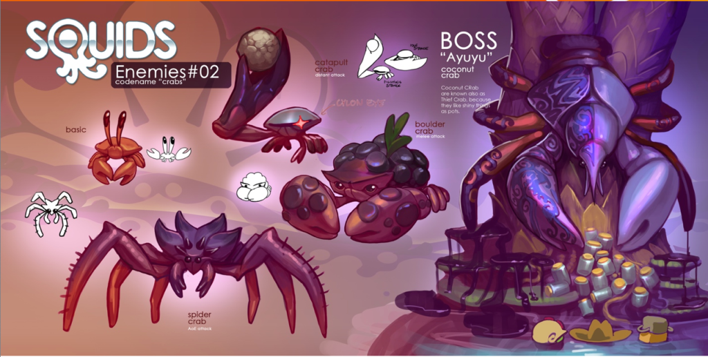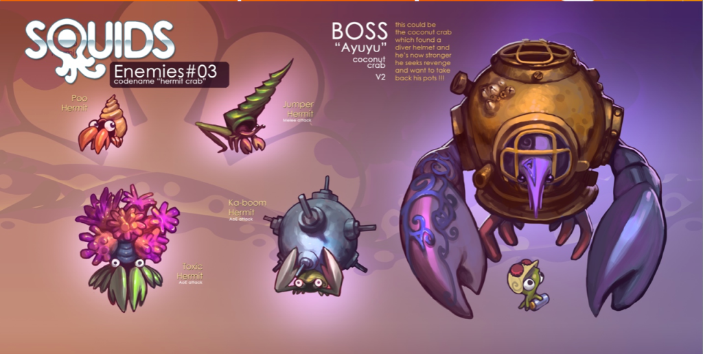 We also looked at shrimps and crabs[2] for the enemies. The big boss of the first game is a coconut crab, while a basic enemy you meet in the game is a hermit crab. You can tell the influences directly from the designs.