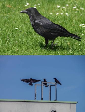Crows have a rounded head, with the plumage arranged neatly on the body; their beak is deeply curved and stout (Fig. 10). Ravens have very long and heavy beaks, ruffled throat feathers, a barrel-like chest and a long neck, which together gives them a heavy-headed impression (Fig. 9). In flight, crows beat their wings more heavily and their fan-shaped tail is clearly seen (Fig. 10). Ravens, however, tend to soar more; the feathers on their wing tips looks more like a raptor’s when flying and they have a long and wedge-shaped tail (Fig. 9). Finally, crows have a far-carrying “caw” vocalization, while the ravens’ calls are a deep and hoarse croak.