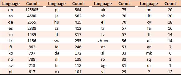 Fortunately, this was also a problem for Google when deciding in which language you’re searching in during your queries, and they were kind enough to opensource their implementation[4]. They used a Naïve Bayes approach, which achieved 99.77% accuracy when classifying news articles in over 49 languages (Nakatani, 2010). Using this approach, we managed to label almost all lyrics by language, identifying 43 different ones in the corpus. The distribution of the languages can be seen in Table 1.