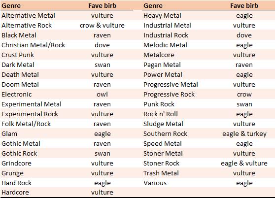The least ornithological genre is Grunge, but one could rightfully argue that “grunge’s not metal” or “who cares about grunge anyway?” So the least ornithological true genres are Dark Metal and Christian Metal (Table 7).