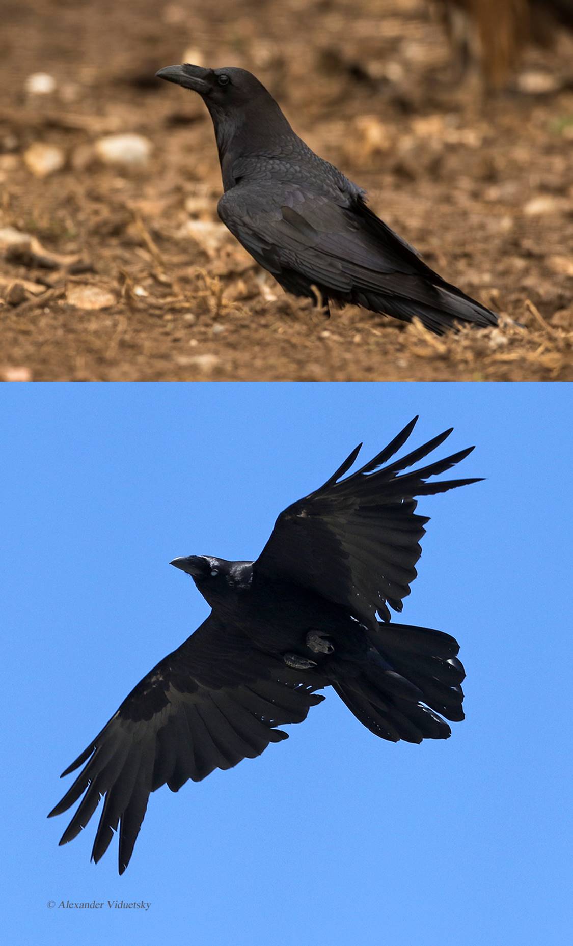 Crows have a rounded head, with the plumage arranged neatly on the body; their beak is deeply curved and stout (Fig. 10). Ravens have very long and heavy beaks, ruffled throat feathers, a barrel-like chest and a long neck, which together gives them a heavy-headed impression (Fig. 9). In flight, crows beat their wings more heavily and their fan-shaped tail is clearly seen (Fig. 10). Ravens, however, tend to soar more; the feathers on their wing tips looks more like a raptor’s when flying and they have a long and wedge-shaped tail (Fig. 9). Finally, crows have a far-carrying “caw” vocalization, while the ravens’ calls are a deep and hoarse croak.