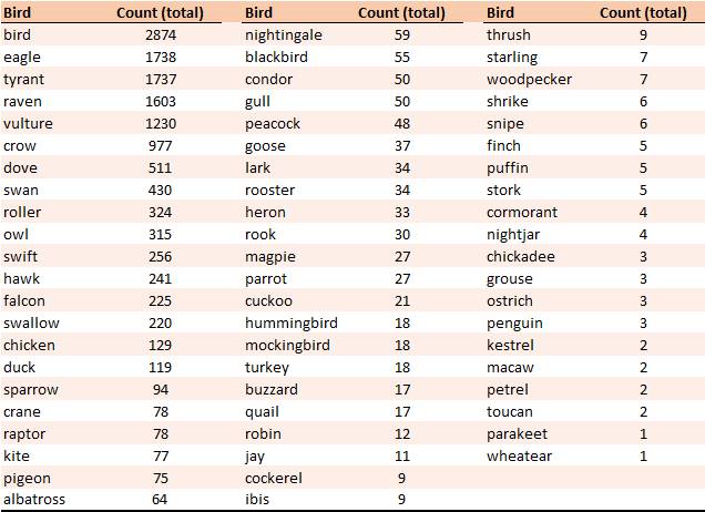There are some unexpected results. For starters, we imagined hawks and falcons would rank higher on the list, as well the nightingale, which is typically associated with song and poetry. We also have lots of mentions to ducks, geese and chicken, but a good portion of them refer to expressions (e.g., sitting ducks) or, metaphorically, to people.