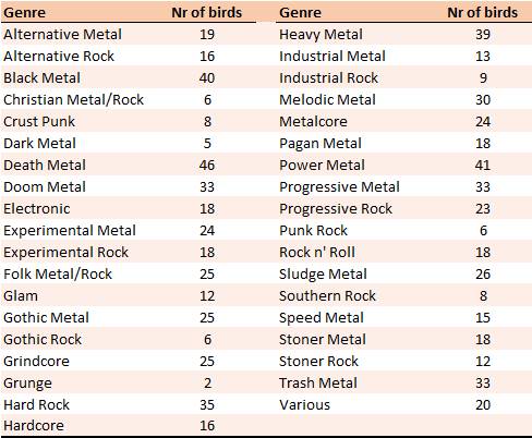The least ornithological genre is Grunge, but one could rightfully argue that “grunge’s not metal” or “who cares about grunge anyway?” So the least ornithological true genres are Dark Metal and Christian Metal (Table 7).