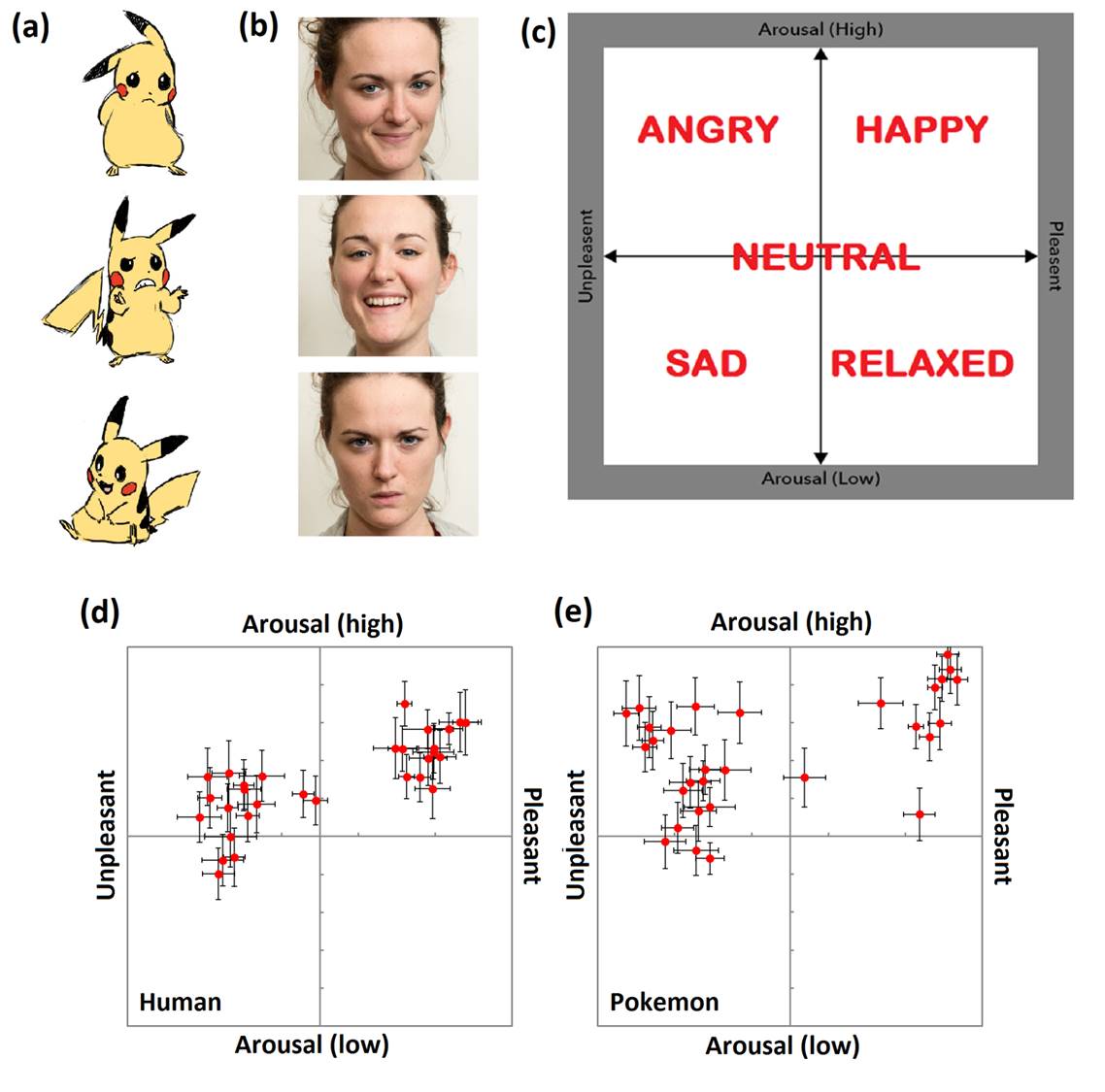 Figure 1. Panels (a) and (b) illustrate 3 exemplars of the Pokémon and human stimuli, respectively. Panel (b) shows the response grid displayed on each trial for classifications to be made within (note: the red wording was not visible during testing). Panels (d) and (e) show locations of perceived emotion in the human and Pokémon stimuli, respectively. Error bars present one standard error.