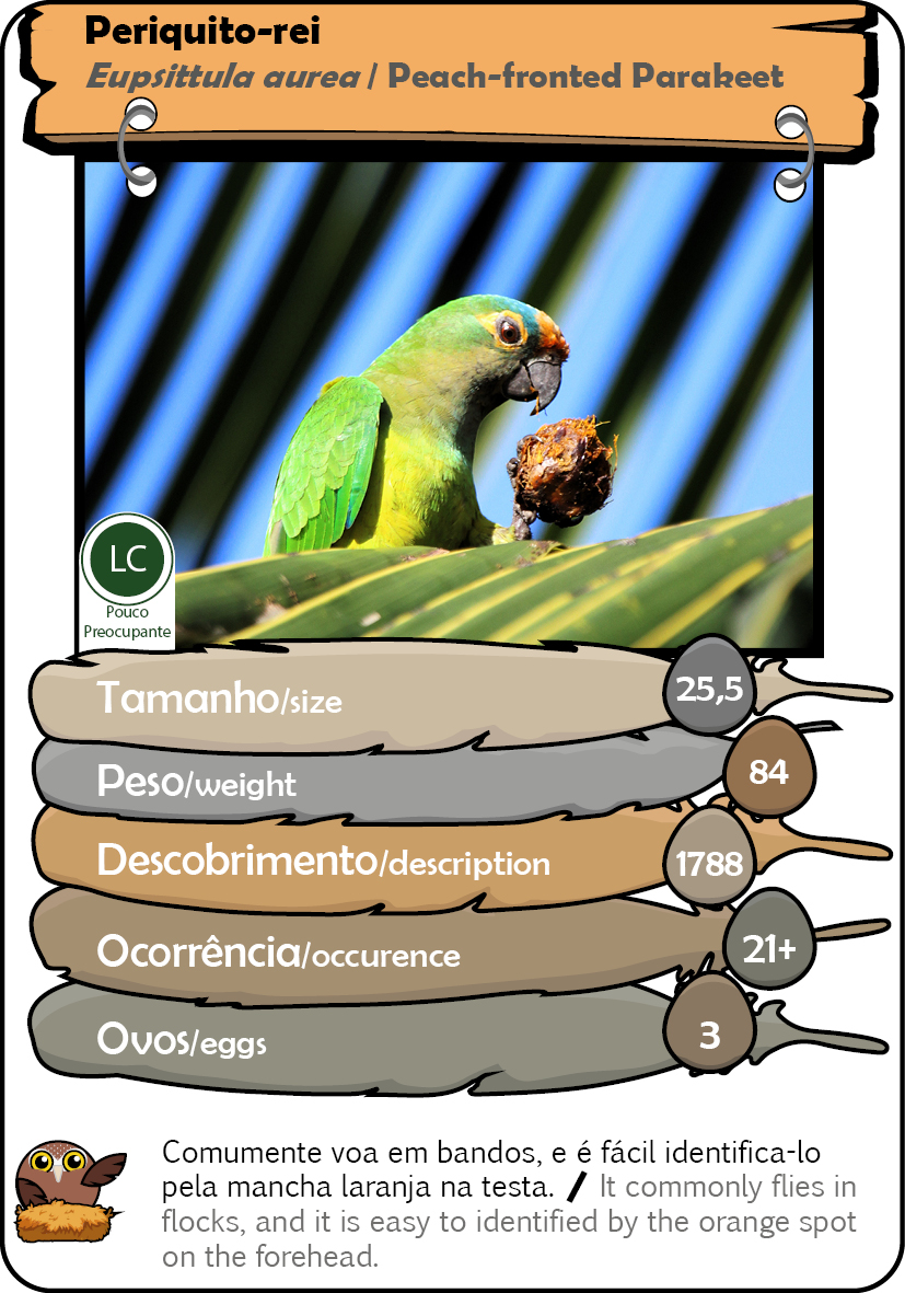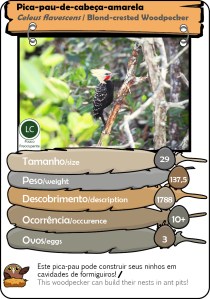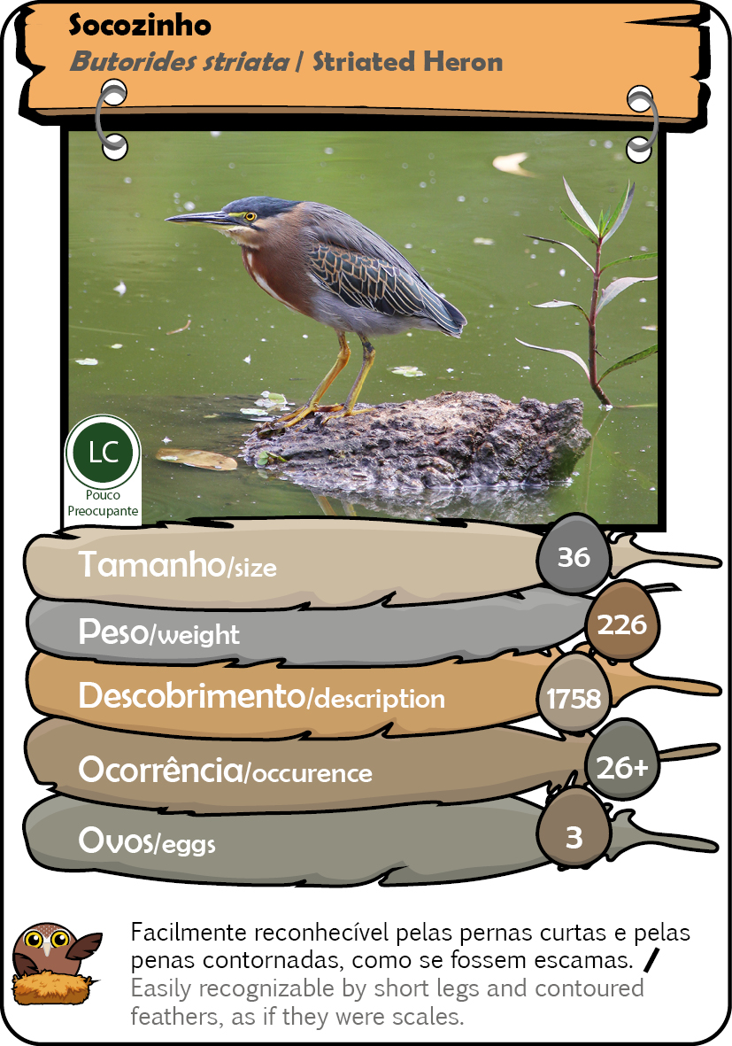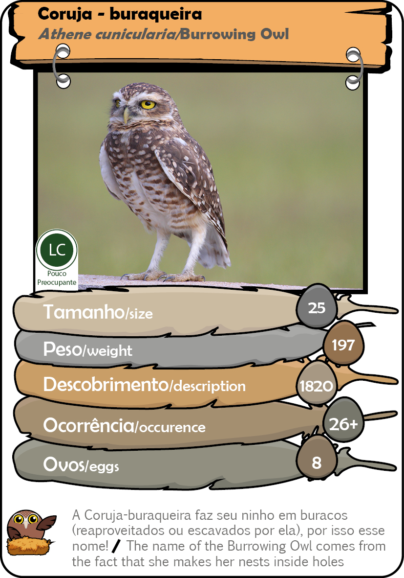 In the game, each card represents a species, containing its popular name, scientific name, and some features of the bird species it represents, such as: weight, size, year of description (“discovery”), number of eggs it usually lays, its geographic distribution in Brazil, and a bit of trivia. The cards are bilingual: in Portuguese and English.