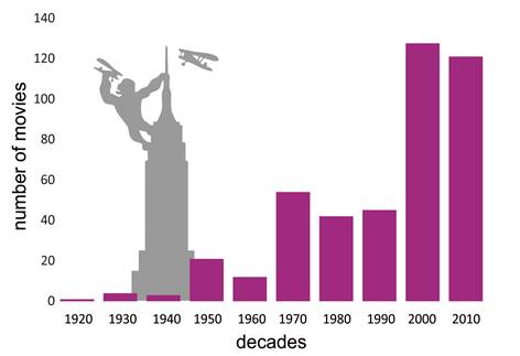With the use of CGI (Computer Generated Images) in more recent times, this subgenre increased exponentially. There were 190 killer animal movies released before the year 2000 (in nearly 100 years of cinema history) and more than 250 movies since (Fig. 2). This dramatic increase of killer animal films started with the influential Jurassic Park (1993).