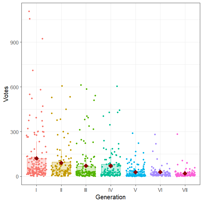 However, to go further in the interpretation, we have to take into account the generations; as we have seen earlier, they influenced the results. Moreover, not all clades are well represented in all generations, that is, the proportion of Pokémon by clade vary a lot among generations. To compare popularity of Pokémon according their animal clade, we have to take these factors into account along the number of votes (Fig. 3).