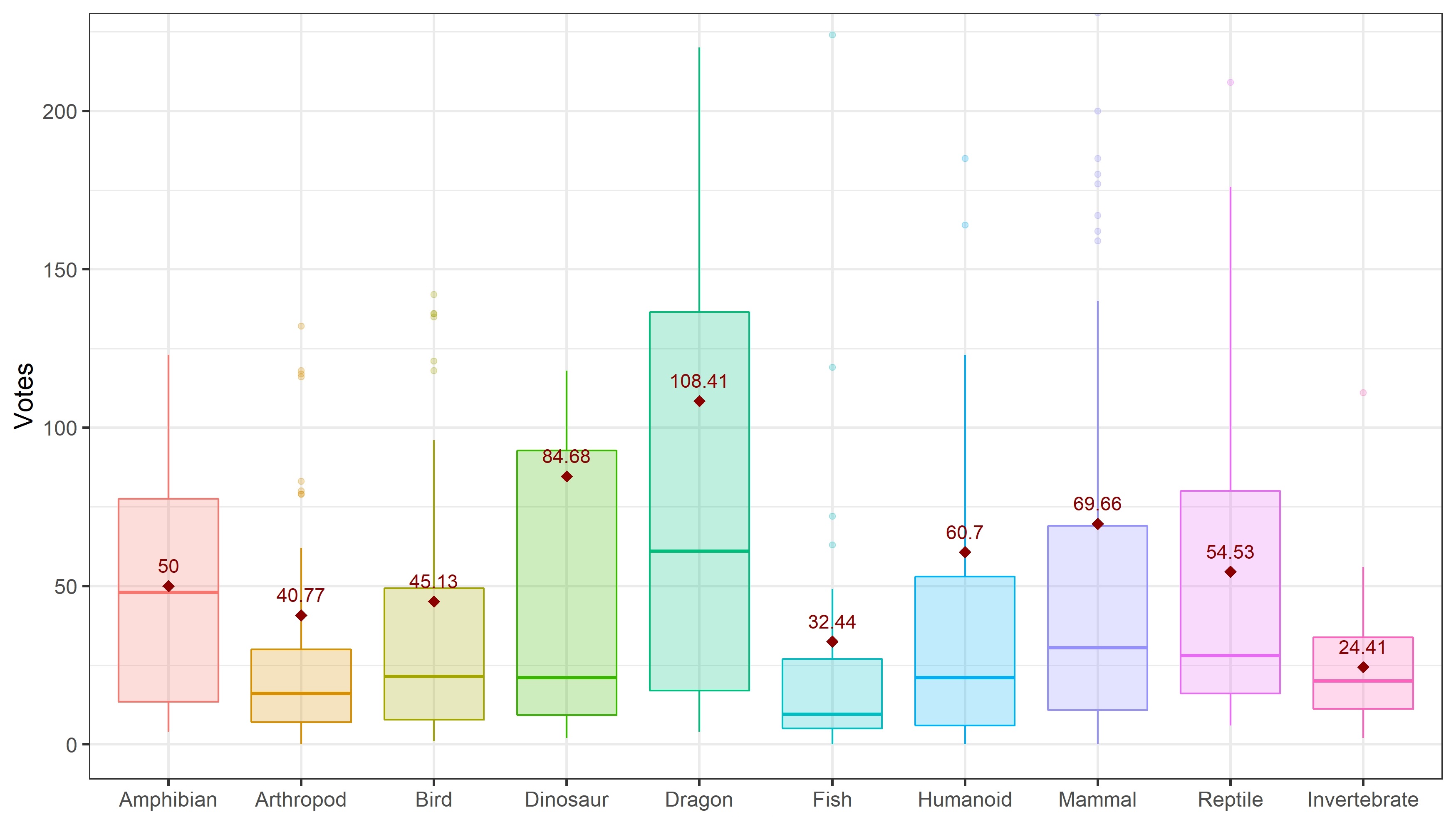 The emotional side is also influencing the vote. Among the first 20 most voted Pokémon, 7 are starters and concentrate the majority of votes (Table 2). The average number of votes for the starters are significantly different from the Pokémon that have “no advantage” (Wilcoxon test, p-value = 7.6e-8). This means that most of the favourite Pokémon are actually the most used monsters in the games, which makes gamers feel closer to them. However, the starters have been purposefully chosen by game developers to be popular due to their resemblance to popular animals, real or mythological. For instance, several starters are reptiles/amphibians with a dinosaurian or a dragon-like design (around 47%); the rest are mammals (39%) and birds (14%). Because this clearly doesn’t represent real animal biodiversity (where well over 90% are invertebrates) and also creates a large bias in the results, the starters were removed from the rest of the analyses.