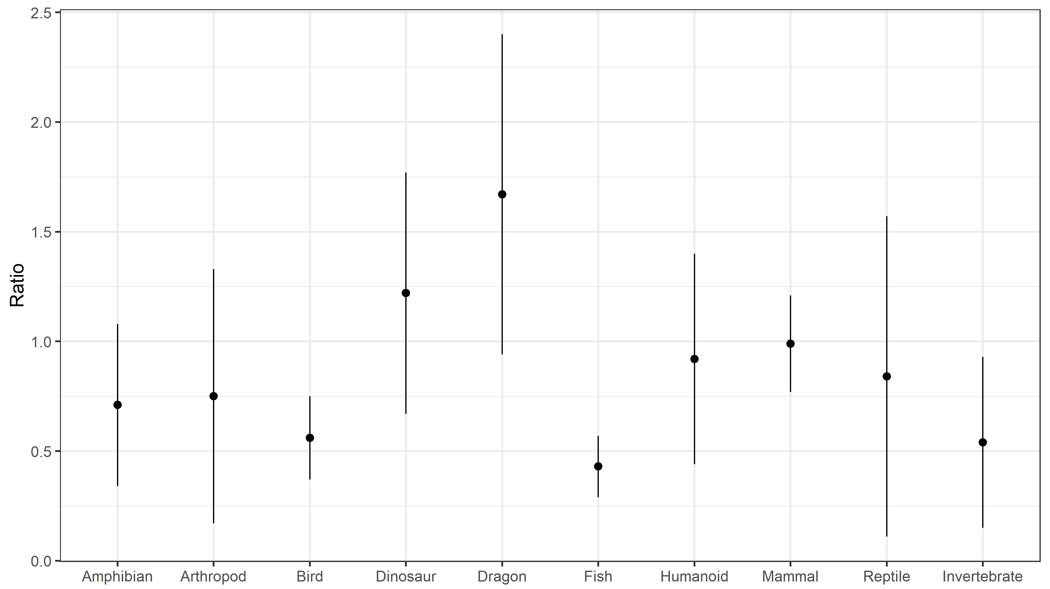 Following the success of dinosaur-like Pokémon, reptiles and amphibians also obtained a high popularity score, placing before birds. This is quite surprising because birdwatching (or birding) is a popular hobby all around the world (Cordell & Hebert, 2002), whereas interest in herpetology (the study of reptile and amphibians) is less common. Real-world birds are, on average, more appreciated than reptiles and amphibians (Schlegel & Rupf, 2009) and stimulate more curiosity and affinity (Zimihorski et al., 2013). However, the number of bird Pokémon (52) relative to reptiles (17) and amphibians (15) can influence the design conception and their success. Birds represent a large amount of diversity, from the smallest and cutest birbs to the largest and impressive ones (the latter usually represented as legendary Pokémon). The success of bird Pokémon depends mainly on what particular species they represent and their own perceived reputation, which can unbalance the ratio of votes.