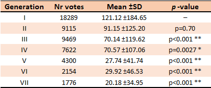 The average of votes per clade was thus corrected according to the generation: by dividing the average votes per clade by the weight of each generation, we obtained a ratio of votes by clade (Table 3, Fig. 3). If we compare the ratio of votes (corrected for generation; Fig. 4, Table 2) with the mean number of votes per clade (Fig. 2, Table 4), we can see that general patterns of favourites are also conserved (Table 3).