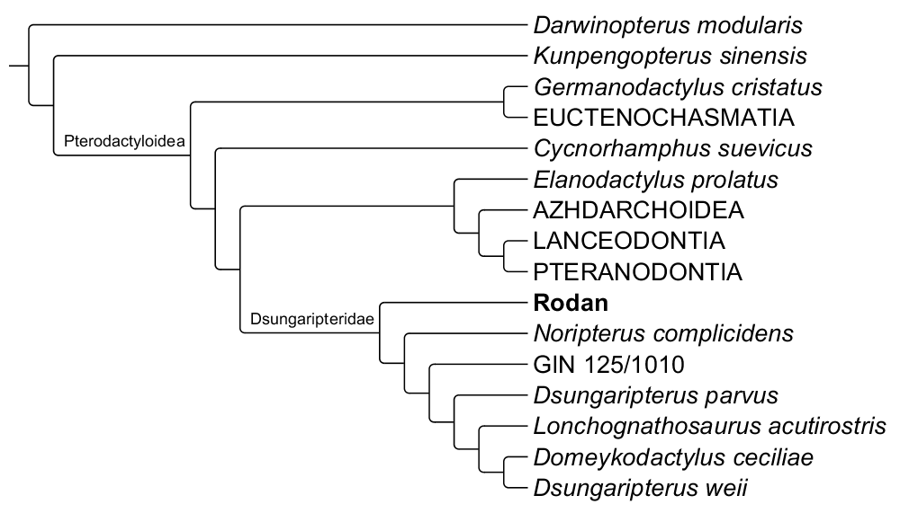 Suppose, for a second, Rodan was real. If you’re anything like me, you may ask: where would it fall on the pterosaur family tree? To answer this question, I coded Rodan into a phylogenetic analysis of pterosaurs I’ve been working on (Thomas, 2018), using what anatomy I could infer from its external appearance. Rodan ended up nowhere near Pteranodon or the giant azhdarchids, but inside Dsungaripteridae (Fig. 5). Dsungaripterids are the only pterodactyloids that have both toothless anterior beaks and posterior teeth, as Rodan does. The subtriangular skull outline and posterior crest of Dsungaripterus (Fig. 2) and Noripterus compare well with the outline of Rodan’s head. Dsungaripterids are also noteworthy for having unusually thickened bone walls (at least 3 mm, compared to less than 2 mm in most pterosaurs) and overall being more robust than most pterodactyloids, traits that would befit a kaiju-sized pterosaur.