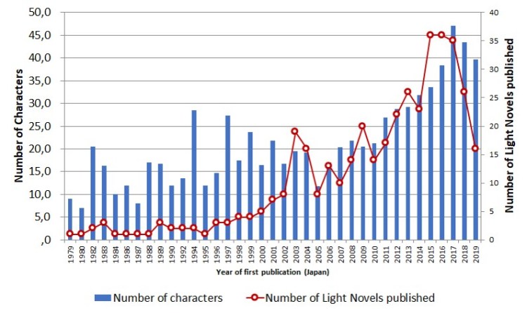 Two analyses of the increase in the size of light novel titles have been done in the past. The first one was conducted by Twitter user @GenreCodeLovers, who compiled a list of light novel titles from the website Ranobe Mori and analyzed the number of Japanese characters (apparently not corrected for polysyllabic kanji) in them (reported by Parker-Dalton, 2019). The second one was made by YouTuber Red Bard (2019), who compiled a list of English titles from the website MyAnimeList and counted the number of words, in order to identify the moment in which titles became so long. She concluded that the movement started between 2009 and 2013, but really caught on in 2014.