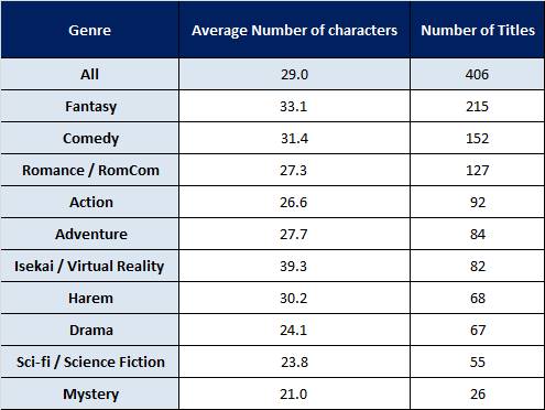 Once the “most popular” genres were defined, we calculated the average number of characters per title for each genre. The results are shown in Table 1.