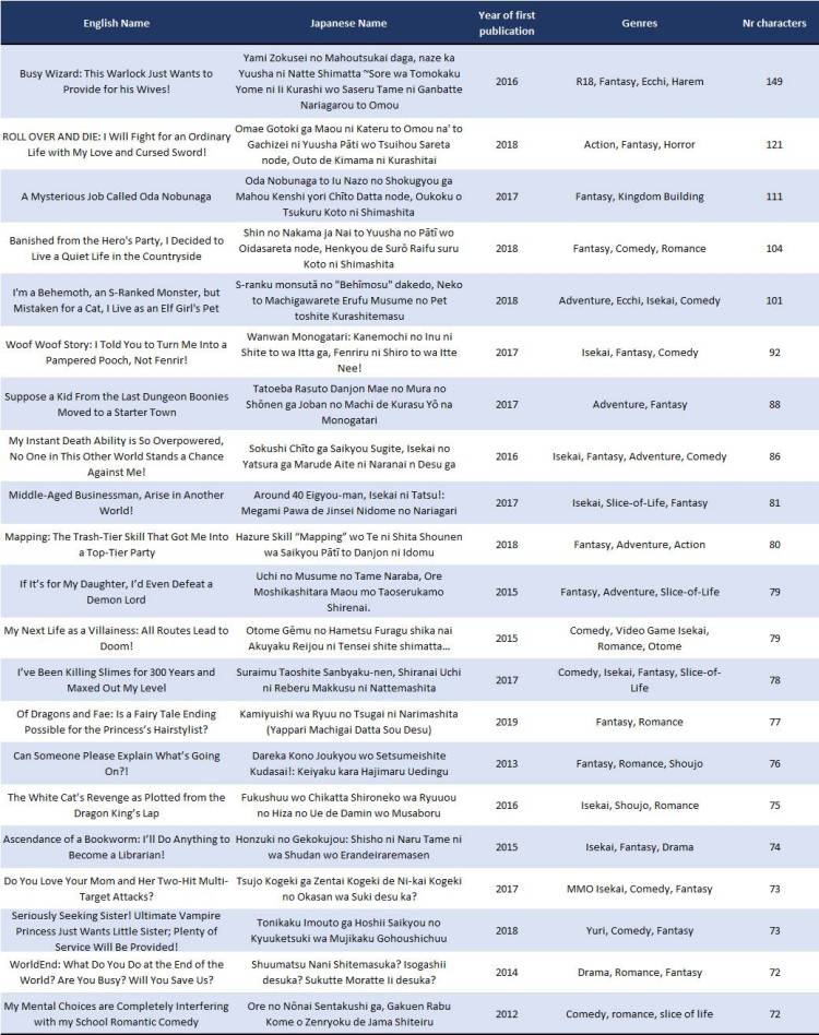 From this first analysis, we can clearly see an increase in the number of novels published and a clear increase in the average number of characters since the late 1970s. The years of 2018, in particular, had a whooping average of over 45 characters per title. The longest title award, though, goes to the R18 novel published in 2016 Yami Zokusei no Mahoutsukai daga, naze ka Yuusha ni Natte Shimatta ~Sore wa Tomokaku Yome ni Ii Kurashi wo Saseru Tame ni Ganbatte Nariagarou to Omou, or “Busy Wizard: This Warlock Just Wants to Provide for his Wives!” (Fig. 5).
