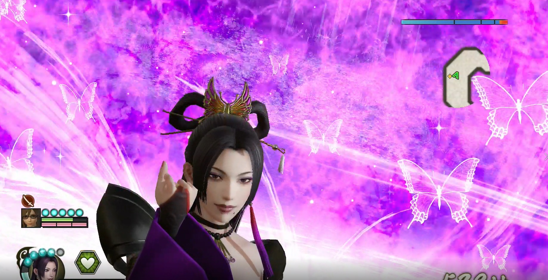 A series of action games, Samurai Warriors (戦国無双, Sengoku Musō; by Koei), is set during the Japanese Civil War in the 16th century, and its first product went on sale in 2004. Players operate military commanders, or their wives or sisters, aiming to defeat the opposing army. One of the popular characters, Nōhime, is a voluptuous and mysterious lady who is called “a butterfly accompanying her husband, like Satan”. She usually fights by using long claws and sometimes releases many purplish-red butterflies to initiate explosions that kill many enemy soldiers (Fig. 2).