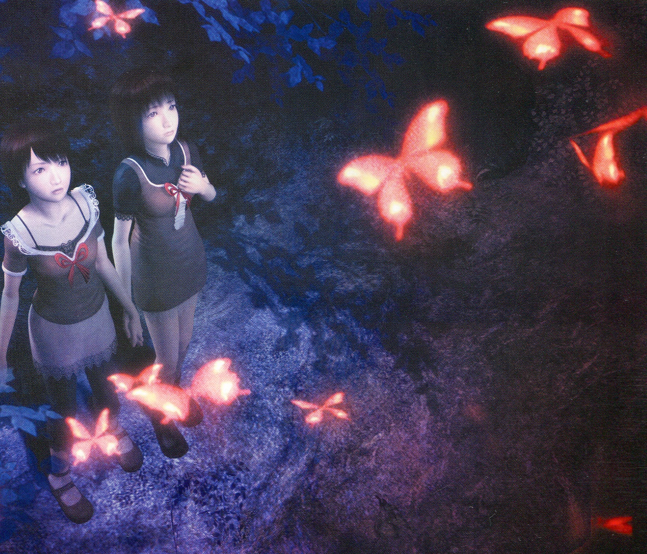 Fatal Frame II: Crimson Butterfly (零. 紅い蝶, Zero: Akai Chou; by Tecmo), released in 2003, is a horror video game where the main characters are the sisters Mayu and Mio Amakura. They see a few red butterflies in the dark forest and are directed to an accursed village by those butterflies, in which a series of murders occurs and many evil spirits ramble about (Fig. 6). Players control the sisters and aim at escaping safely from the village.