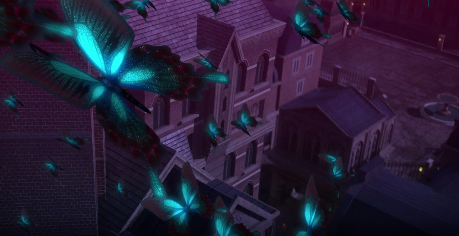 Nights of Azure (よるのないくに, Yoru no Nai Kuni; by Koei Tecmo) went on sale in 2015 and is a horror action role-playing game set in early modern Europe. In its world, many monsters dominate cities at night. The heroine, Arnice (アーナス), is a holy knight, who leaves for a battlefield filled with monsters on an order from the holy Pope. In the opening movie of the game, a cloud of blue butterflies flies in the darkness (Fig. 7).