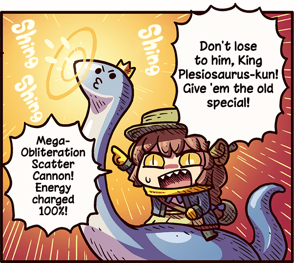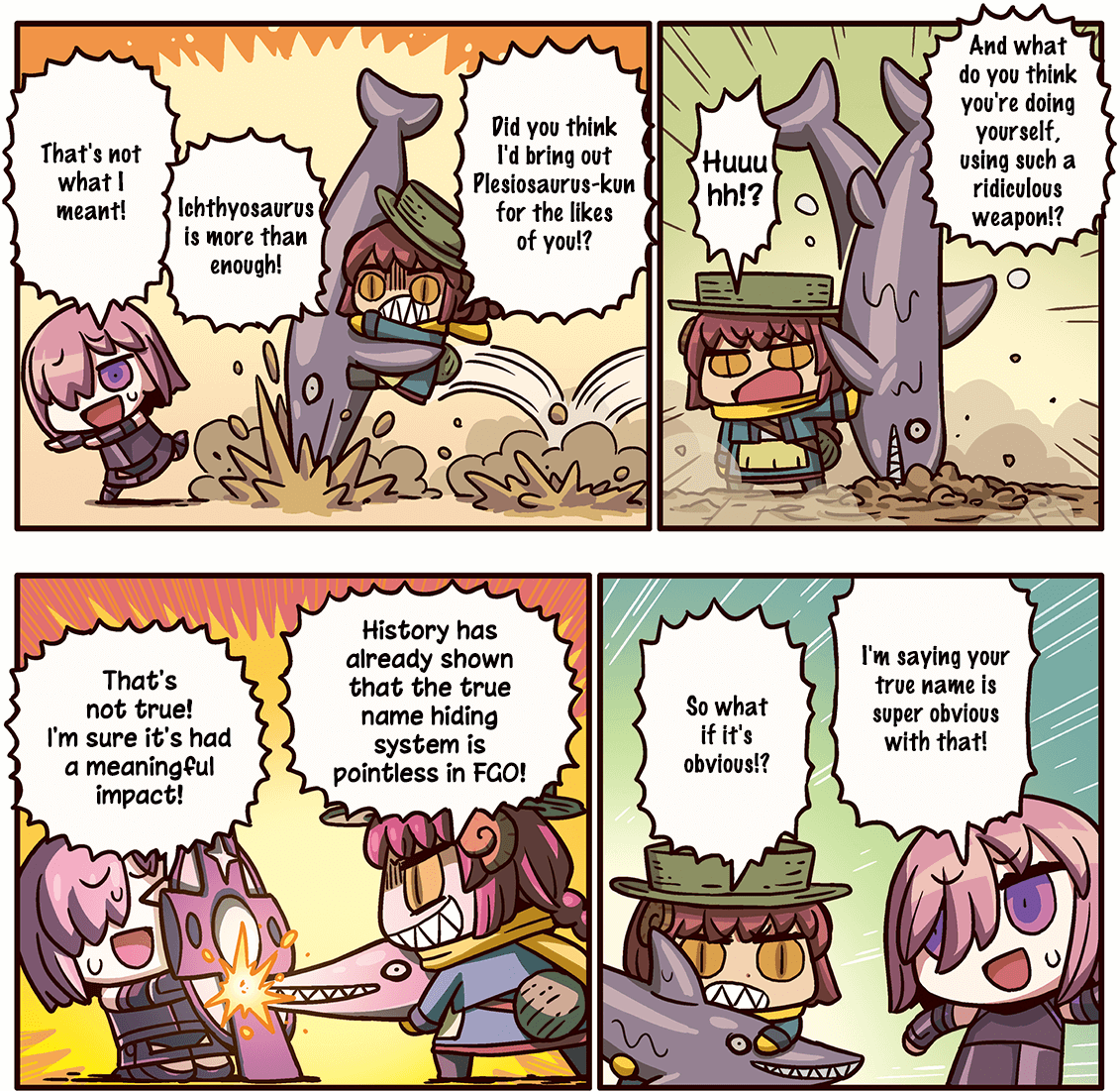 She is not part of the game (yet[5]) and only appears in a comedy manga about FGO called Learning with Manga![6] That manga initially revolved around explaining the basics of the game in a fun way, with chibi versions of the characters. Later on, however, it developed its plotline (please note that I’m using this term very loosely). Learning with Manga! (henceforth LWM) pokes fun at game mechanics and player behavior, also advertising in-game events and (sometimes) merch. The manga series was a success and had a second and third (current) seasons, respectively: More Learning with Manga! and Even More Learning with Manga! Mary Anning appears in the latter.