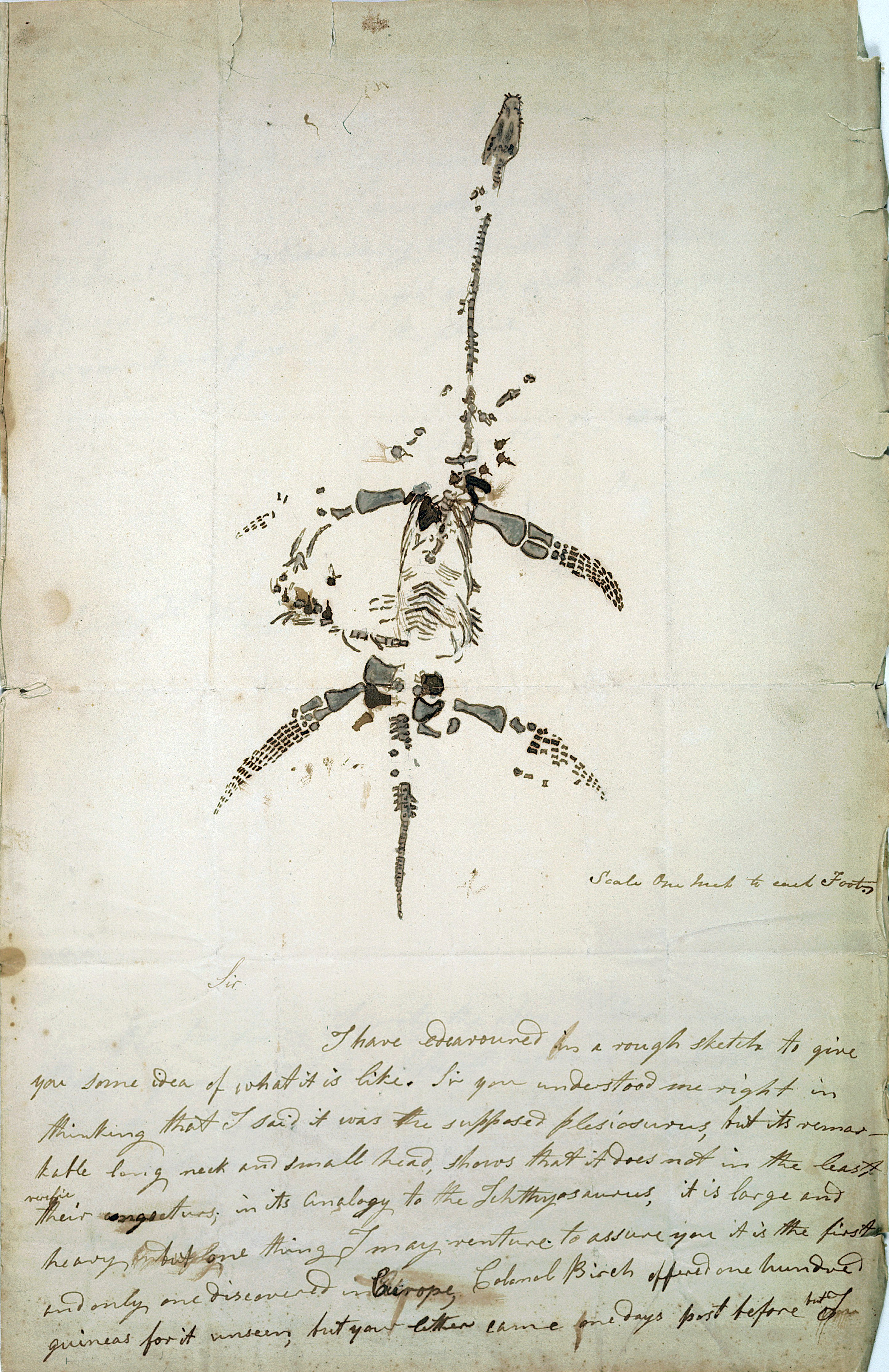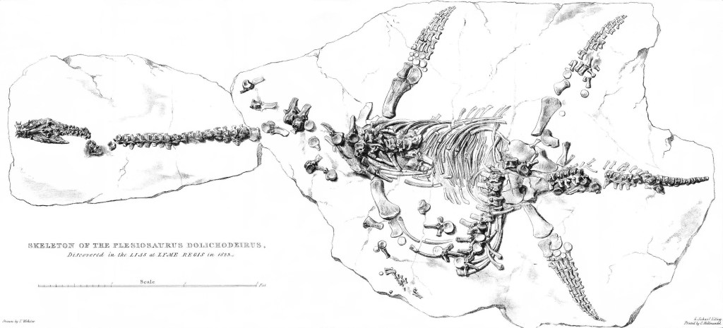 A few years later, another of the Annings’ important finds was described: a plesiosaur (meaning “near-lizard”; De la Beche & Conybeare, 1821). The fossil was so weird, that at first people thought it was a forgery, made up of mixed bones (Rudwick, 1985). When it was finally confirmed that the plesiosaur fossil was real, Mary’s reputation as a fossil hunter became established. Furthermore, that fossil defined what’s possibly Anning’s Noble Phantasm in LWM.