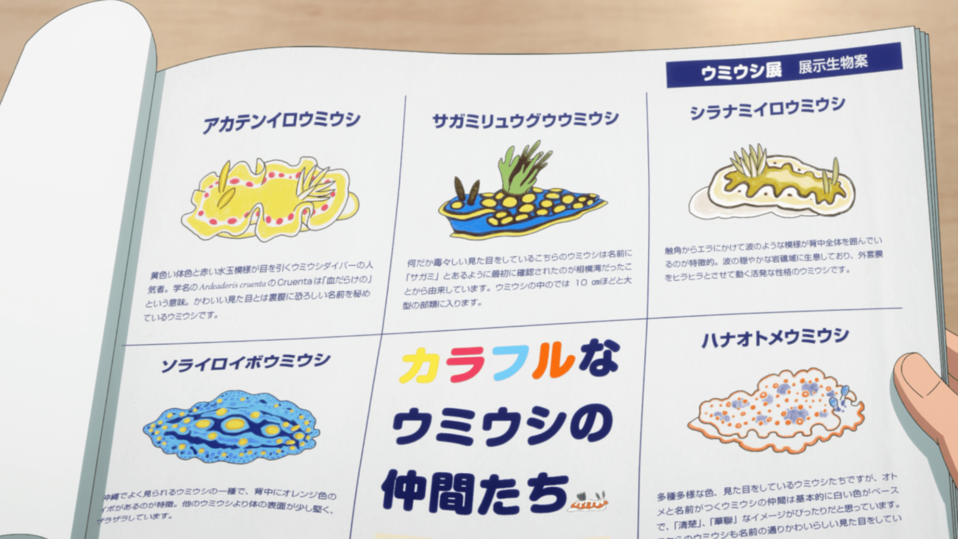 In episode 15 of Aquatope, protagonist Kukuru is tasked by her boss to come up with ideas for a special temporary exhibition. One of her ideas – and the one that her boss greenlights – is an exhibit of umiushi (Fig. 8).