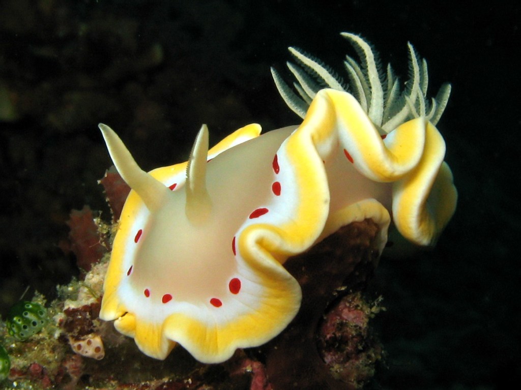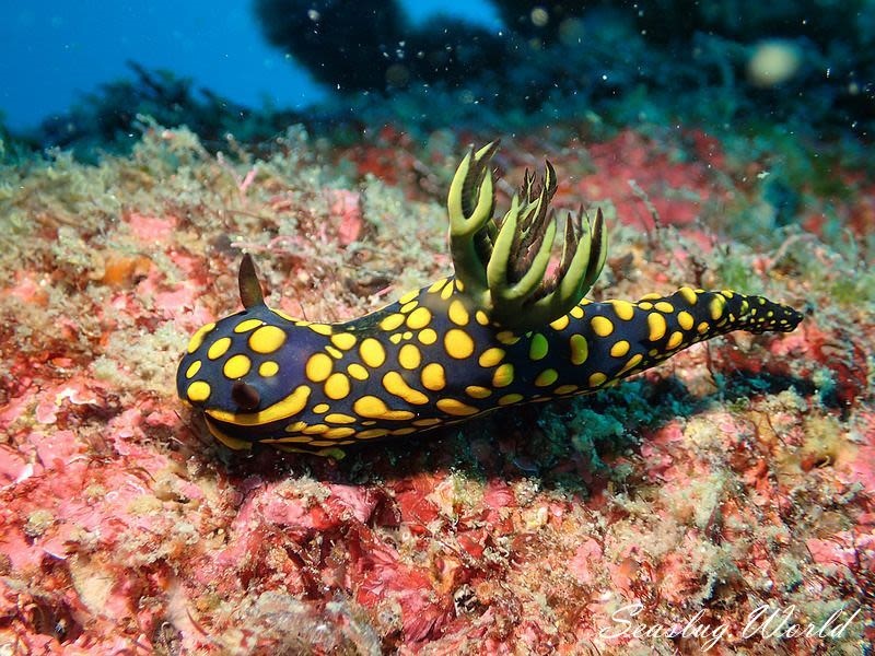 黄色い体色と赤い水玉模様が目を引くウミウシダイバーの人気者。学名のArdeadoris cruentaのCruentaは「血だらけの」という意味。かわいい見た目とは裏腹に恐ろしい名前を秘めているウミウシです。