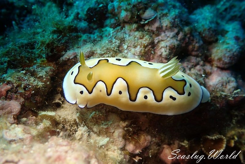 触覚からエラにかけて波のような模様が背中全体を囲んでいるのが特徴的。波の穏やかな岩礁域に生息しており、外套膜をヒラヒラとさせて動く活発な性格のウミウシです。