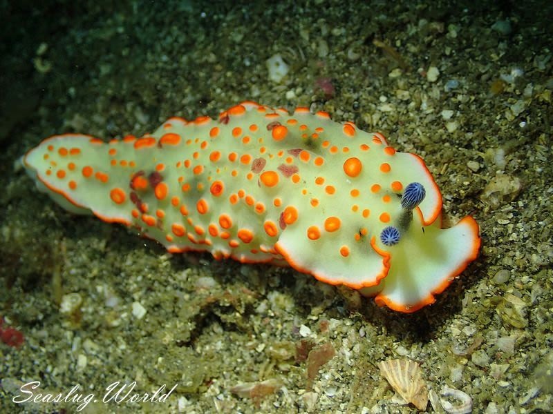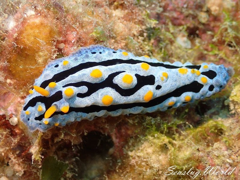 [A type of nudibranch commonly found in Okinawa, characterized by the orange warts on its back. The surface of its body is a little harder and rougher than other sea slugs.]