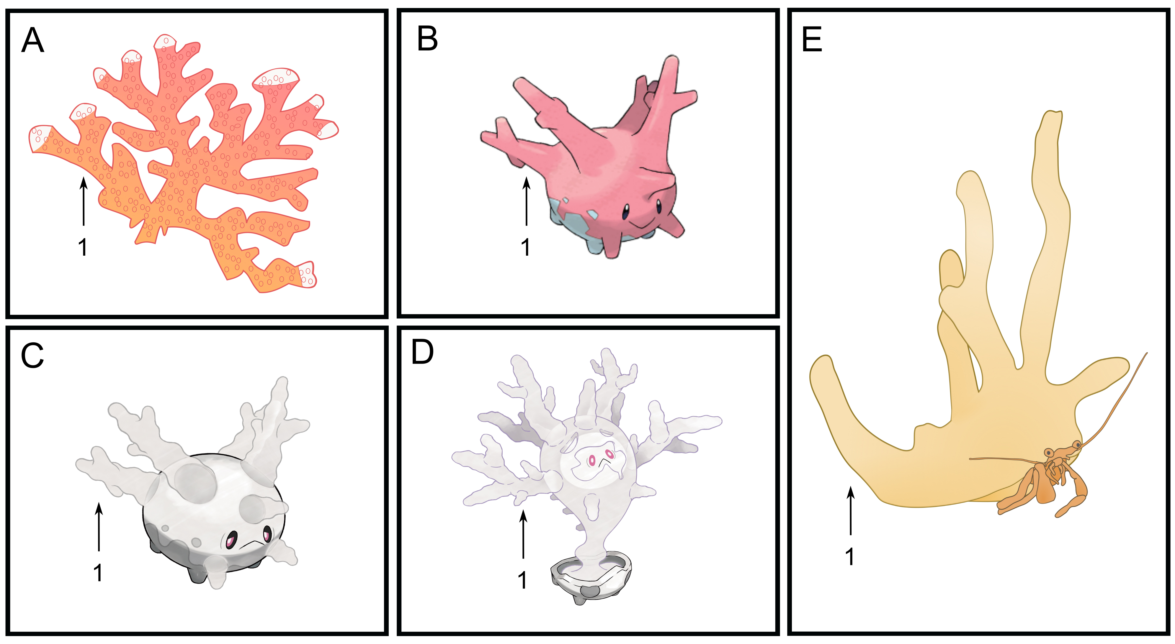 There are two Pokémon that are inspired by real corals (Fig. 3). Corsola (#222), from the Johto region, is a Water/Rock Pokémon with regenerative abilities that inhabits warm sea waters. Another version of Corsola is the one from Galar, a ghost-type Pokémon that evolves into Cursola (#864). Galarian Corsola is Ghost-type because it became fossilized due to the impact of a meteorite in the Galar region (The Official Pokémon Website, 2023).