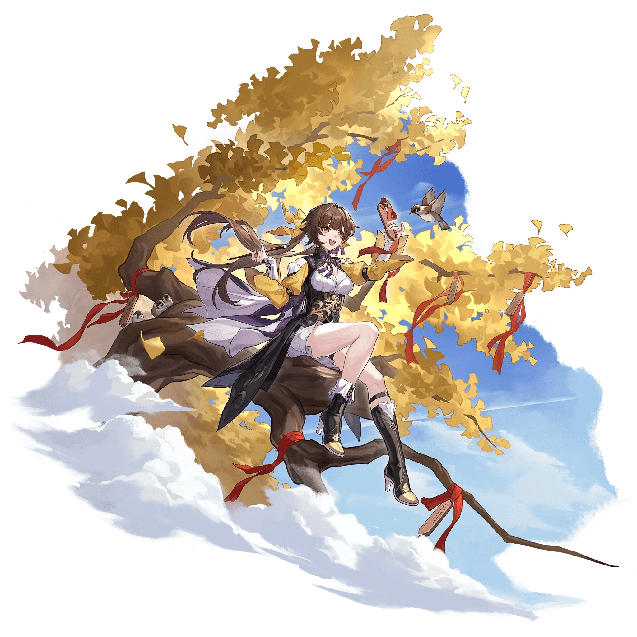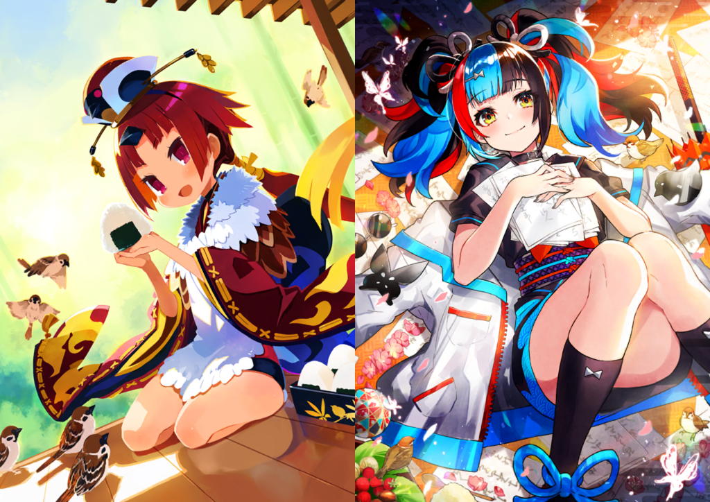 Figure 10. Examples of tree sparrows in another gacha game, Fate/Grand Order: final ascension artwork of the characters Beni-Enma (illustrated by Harada Takehito) and Sei Shounagon (illustrated by Mika Pikazo). Beni-Enma is based on the Japanese fable “The Tongue-Cut Sparrow”. Source: Fate/Grand Order Wiki (https://fategrandorder.fandom.com/).