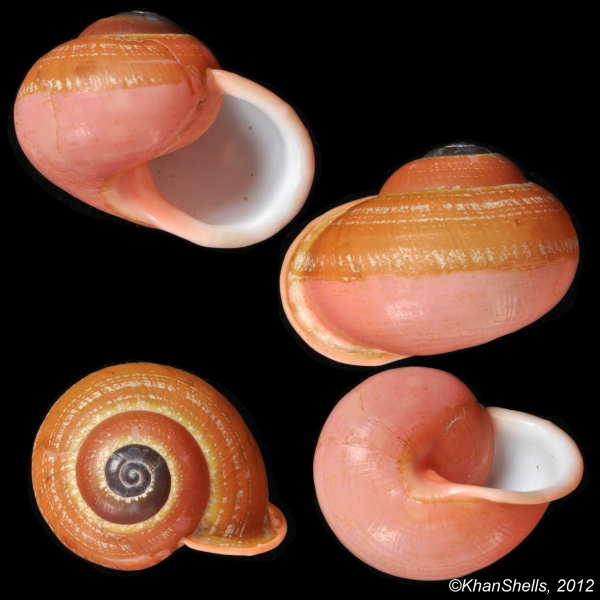 But there’s a catch. If you search online for “pink snail” you’ll run across one species called Calocochlea festiva. Sometimes you’ll find it under the outdated names Calocochlia festiva or Helicostyla festiva. It is from the Philippines – a country which has some of the most beautiful snails in the world – and it is fabulously pink indeed (Fig. 5).