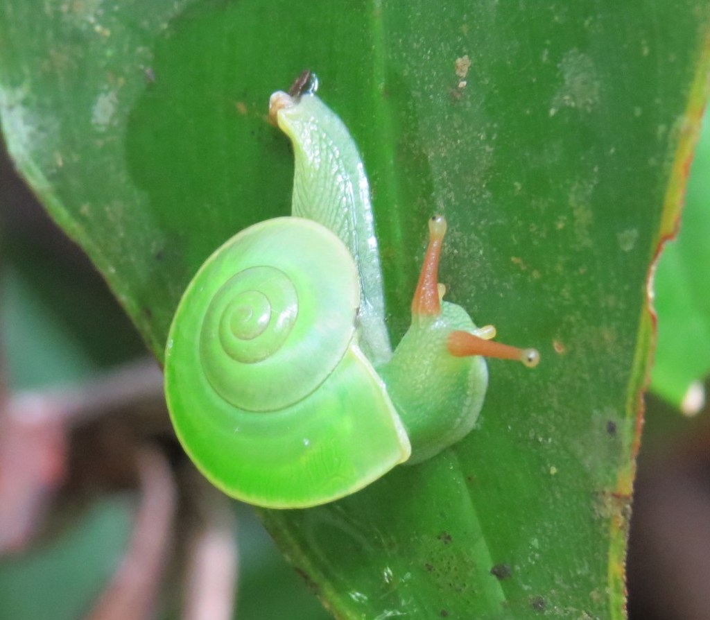 Now, let us move on to the flashy green soft body of Mario Wonder’s Snail. A green body is rather uncommon in nature, but there are a handful of examples of it where varying tones of green are represented. For instance, the soft body of Leiostracus perlucidus from Brazil is light green (Fig. 8; its shell is actually whitish and translucent), while that of Rhinocochlis nasuta from Borneo has a more vivid green color (Fig. 9) that is more similar to Mario Wonder’s Snail.