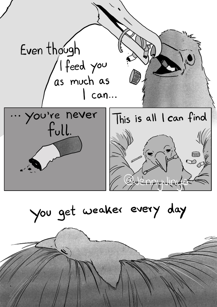 For example, if I tell you over 1 billion seabirds suffer and die from eating ocean plastics every year,[5],[6] that’s hard to imagine – hard to ‘feel’. But I challenge anyone not to be affected by Jenny’s comic, and I’ve had people from all over the world tell me that it was this comic that changed the way they felt about single use plastics and cigarettes.